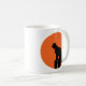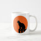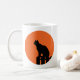 Um gato preto que senta-se em uma cerca na frente de uma lua alaranjada completa para o Dia das Bruxas.