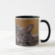 Um gato cinzento bonito que encontra-se para baixo no assoalho que olha direito em você em uma pose muito familiar do gato com patas ondulou. A foto cobre a caneca inteira. Se você é canhoto, você pode personalizar a caneca facilmente invertendo a foto.