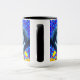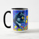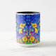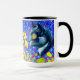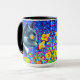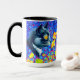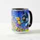 Café Mug com pintura animal de Louis Wain Cat no Mar de Flores (1860-1939). Um gato preto e branco com olhos ouros cheira a flores amarelas. No fundo roxo estão flores azuis. Um presente maravilhoso para amantes de gatos e arte inglesa.