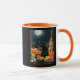 Um gato preto se senta na porta com abóbora, mais tarde, folhas de outono e lua de colheita de cheio atrás.