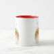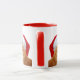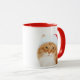 Gato de gato malhado alaranjado de cabelos compridos em caneca ou em um copo do Natal dos amantes do chapéu do papai noel e do gato da barba.