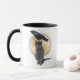 Um corvo cortado da cabeça de um gato cinza na frente de uma grande lua de cheio nesta caneca de café do Halloween.
