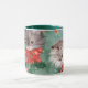 Imagem bonita do vintage das caras pretas, cinzentas e brancas do gato que jogam ou que vestem um arco vermelho da fita. Misturado em um fundo verde, com algumas folhas do visco, este design é perfeito para amantes do gato.
