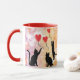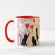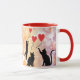 Três imagens da silhueta de gatos com balões cardíacos sobre fundo pastel.