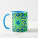 Caneca de café em padrão geométrico de abstrato, em tons de verde limão, azul-cerulano e turquesa, acentuados com azul profundo