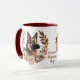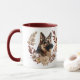 Uma bonito coroa de outono em tons de cinamão marrom, bronzeado e creme rodeia a imagem de um Cão German shepherd. A imagem é impressa duas vezes na caneca, com seu texto personalizado entre eles. Você pode facilmente substituir o texto pelo seu nome, se preferir.