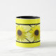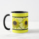 Os girassóis ensolarados contra um preto entrecruzaram o fundo e aparamentos pretos. Uma caneca de café vívida para ajudá-lo começa seu dia. Para um presente especial, inclua esta caneca com artigos de papelaria de harmonização, envelope, e carimbe igualmente disponível para um grupo verdadeiramente completo do presente dos artigos de papelaria.