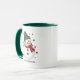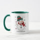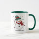 Um bonitinho bonitão desenhado com um boné de meia-luz de jade com banda vermelha de brilho. Botões metálicos negros brilhantes no corpo. Esta caneca de café do boneco de neve de Natal está esportivando um cachecol de xadrez vermelha. Ele rodeado por estrelas de burgundy e jade. Personalize o nome com seu próprio texto ou outro texto desejado.