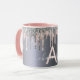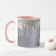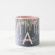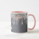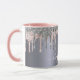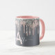 Uma caneca de moda e moda. Um fundo com aspecto cinza, decorado com gotas de brilho cor-de-rosa e falso prateado, aparência de pingar de tinta. Personalize e adicione um nome e uma letra monográfica. Letras brancas e cor de rosa. O nome é escrito com um moderno estilo escrito à mão com traços. Para manter as hastes, exclua apenas o nome da amostra, deixe os espaços ou emoji na frente e depois do nome.