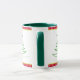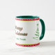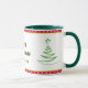 Esta é uma bonito caneca de presente de Natal, com imagens estilísticas de arte de uma árvore de Natal verde com estrela em cada lado, e o texto artístico a verde se bordou com "Feliz Natal" vermelho no meio. Abaixo da saudação está seu texto personalizado em verde. As imagens e o texto são colocados sobre fundo branco, e a caneca é bordada por cima e por baixo, com uma bolinhas vermelha decorativa revestida em ouro. Elegante!