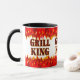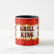 Uma caneca lendo Grill King em letras esmagadoras com chamas vermelhas e laranja no topo e no fundo.