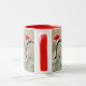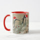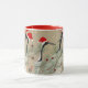 Gruas de Natal se reunindo com amigos, com seus chapéus de Natal e condecoração. Fundo bege maravilhoso com sotaques vermelhos brilhantes. Perfeito para seu chocolate quente ou café.