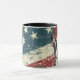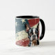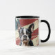 Esta caneca patriótica apresenta um retrato de aquarela de um pequeno cão de Boston Terrier colocado contra um fundo gigante da bandeira dos EUA. Você pode adicionar texto, se quiser, escolhendo Personalizá-lo.
