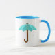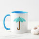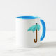 Uma ilustração digital de um guarda-chuva com alça de madeira curva. O guarda-chuva é feito de água, está pingando em todos os lugares e encharcando a alça também.