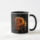 Uma abóbora engraçada e engraçada jack-o-lanterna na forma da letra "P" segurando uma lâmpada com uma chama.