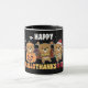 Feliz Hallothanksmas - Feliz Halloween, Ação de Graças e Natal. O castor está vestido como um morcego no Halloween. Com uma torta para o Dia de Ação de Graças, decorada com bonés de Papai noel no Natal.