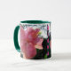 O sol da manhã espreita sobre a parte superior da montanha em Havaí e ilumina acima esta flor do hibiscus. A palavra havaiana "Aloha" no centro da caneca pode ser suprimida se desejada.