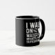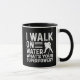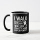 Uma caneca branca sobre fundo preto que você pode mudar para qualquer cor que quiser, lê I Walk On Water What's Your Superpower?