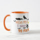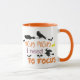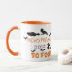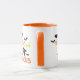 a caneca engraçada do café Costum para o Halloween apresenta um design decorativo moderno de laranja e tipografia negra com bruxa voadora e morcegos ao redor.