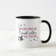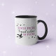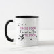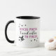 "Hocus Pocus I need cafeinfose", engraçada caneca de café personalizada para Halloween apresenta um moderno design de tipografia roxa violeta e negra com bruxa voadora e sotaques estelares.