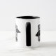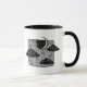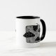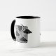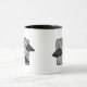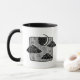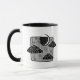 Caneca preta e branca com ilustração gráfica de noite mágica. Desenho a tinta de meia lua, nuvens e estrelas.