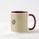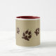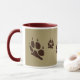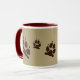 Uma caneca com pata do lobo imprime circundá-la. Os impressões no marrom escuro em um bege coloriram o fundo. Mostre seu apoio destes cantores bonitos e indescritíveis do canino do nighttime.