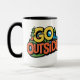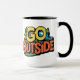 Uma ilustração vibrante e divertida encorajando a exploração ao ar livre. As palavras "VÁ PARA FORA" são exibidas com destaque em um pano de fundo com colinas verdes rolantes, pinheiros, botas de caminhada e um vislumbre de uma bola colorida, sugerindo atividades como caminhar e jogar na natureza.