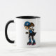 Uns desenhos animados digitais impressionantes de uma menina do rolo que veste o azul, jogando a posição do jammer como rasga em torno da trilha. Seu cabelo longo flui atrás dela como suas rodas cor-de-rosa em seus quadskates giram. Há um espaço para que você adicione seus nome e número de Derby