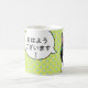 Este gatinho bonito diz do "o gozaimasu ohayou" (bom dia) no japonês. O outro kanji leu simplesmente o "chá". Aperfeiçoe para o amigo em sua lista que prefere o chá sobre o café!