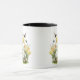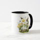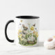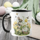 Caneca de café com uma ilustração aquosa de um coelho castanho saltando de um Primavera de tulipas amarelas, narcisos e verde com uma cesta de ovos de Páscoa salgados na frente da ilustração e borboletas coloridas se revirando. Estilos adicionais e cores da jante e da alça disponíveis.