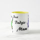 A caneca apresenta um orçamento verde em voo e um orçamento azul pálido piscando, com as palavras 'Melhor Mãe do Mundo' impressas em volta da caneca.
