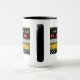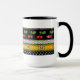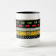 Design original alegre com bordas empilhadas de preto em pontos de alfinetes brancos, brancos em bolinhas pretas, cerejas vermelhas lusaciosas com folhas verdes em preto, estrelas brancas de David esboçadas em preto sobre um fundo amarelo daffodil e pinstripes de primavera verde. Caneca disponível em 2 tamanhos.