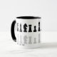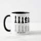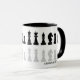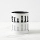 Caneca de xadrez branca e negra clássica para amantes do xadrez, com figuras de xadrez em um padrão geométrico. Design de peças de xadrez modernas