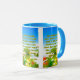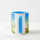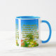 Esta caneca de dois tons mostra uma design que apresenta uma fonte impressão da Broadway com letras verdes contornos amarelos mostrando o verso da bíblia "John 10:10" KJV sobre uma imagem que apresenta uma coleção de flores com uma vista aproximada sob um céu azul claro ao fundo neste tema baseado na fé. Este verso está referindo o Livro de João 10º capítulo mostrando o 10º verso neste tema de citação da bíblia do Rei James bíblia. A jante e o manípulo são vidrados em cores compatíveis, disponíveis em micro-ondas e máquinas de lavar louça de tamanho 11 onças ou 15 onças, construindo cerâmica segura.