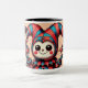 Esta imagem captura uma cena balbuciosa com um sorriso alegre em um traje vibrante interagindo brincalhão com um pássaro minúsculo. O éster tem um sorriso largo e amigável e olhos grandes e circulares. O personagem veste um chapéu de giz com padrões alternados de listras e espirais em vermelho e azul com sotaques brancos. As coleiras recheadas do joelho ao redor do pescoço e pulsos combinam com o esquema de cores do chapéu. Em uma mão, o éster segura um cetro ou uma varinha com um ornamentado, girando design a partir do qual as gotículas parecem estar caindo. Um pássaro pequeno, colorido de forma semelhante ao éster, é poleirado por outro lado. O uso de vermelhos e azuis saturados cria um contraste surpreendente que enfatiza os elementos fantásticos da trabalho de arte.