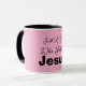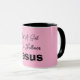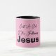 Just a Girl Who Follows Jesus Pink and Black Coffee Mug. Customize further by changing the background color with the Edit Tool. Enjoy!