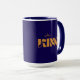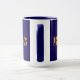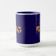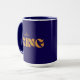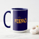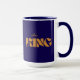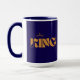 Uma caneca de café azul real, com a palavra "Rei" em ambos os lados, escrita em ouro. Esta caneca é uma opção de presente de excelente para qualquer ocasião, incluindo aniversários, Dias de os pais e Dia de Apreciação de Professores. Também pode ser um bom presente para si.