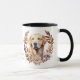 Uma bonito coroa de outono em tons de cinamão marrom, bronzeado e creme rodeia a imagem de um Cão Labrador Amarelo do Retriever. A imagem é impressa duas vezes na caneca, com seu texto personalizado entre eles.