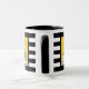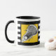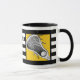 Xícara de lacrosse única com arte de palitos laxistas em fundo amarelo com listras negras e brancas. Para personalizar o texto de edição para adicionar o nome do seu jogador de lacrosse favorito, treinador ou fã de esportes de equipe.