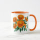 Mug em um buquê de marigolés laranja com centros ouros amarelos e folhas verdes