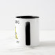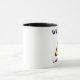 Caneca branca com símbolo de aviso laser amarelo e preto e texto.