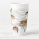 Tumura de latte alta em branco com quatro design de camarão. Camarão ilustrado, mas próximo à vida, com antenas longas e giratórias cobrir a xícara em cores sujas e tem sombras claras, de modo que a imagem pop um pouco da caneca. Também vem numa caneca mais curta.