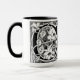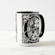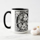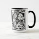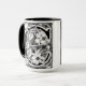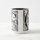 Uma vinha de flor grande enrolou-a à volta desta letra maiúscula "C". As flores são grandes e parecem ser um tipo de lírio. Há folhas e botões de flores na vinha também. O fundo está completamente coberto com linhas estreitas em preto e branco que curvam e torcem para formar um padrão e preencher todo o espaço ao redor deste lindo monograma ornamentado.