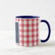 A casa de fazenda decora o padrão de verificação de gingham vermelho e branco com o nome da fonte moderna e magra branca no impressão de denim azul escuro. Altere facilmente o nome, adicione texto para torná-lo seu usando o Modelo fornecido. Esta caneca clássica combo de 11oz tem dentro azul escuro e alça. Escolha entre 9 outras cores. Grande capacidade para bebidas quentes ou frias. Também disponível em 15oz com 5 opções de cores. Estão disponíveis outros estilos e tamanhos de caneca. Consulte "Sobre este produto" para obter mais informações.