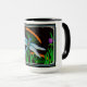 Design gráfico de uma libélula em repouso em algumas flores coloridas.