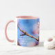 Lindas flores sakura, flores japonesas de cereja. Vista aproximada. Fundo rosa e azul escuro. A alegria da primavera. Linda caneca de café personalizável. Você pode alterar a imagem e pode alterar ou excluir o texto modelo haiku. Você pode transferir este design para uma variedade de outros produtos, incluindo caneca latta, copo de vidro, jarro, bule, tigela chili, pote de doces, garrafas d'água, velas. Basta escolher o produto na opção rolável "Transferir design para um produto". Não se esqueça de usar o botão "Personalizar", ou "Editar design", ou o link azul "Detalhes" —> "Clique para personalizar ainda mais" —> "Preencher/AJUSTADO" para AJUSTAR O DESIGN AO TAMANHO E FORMA do produto, para girá-lo, para alterar a posição, o tipo, a cor da fonte ou para adicionar seu próprio texto do zero. Seja criativo e divirta-se.