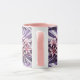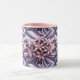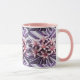 Esta caneca cor-de-rosa apresenta uma imagem de arte digital de sete lírios cor-de-rosa em um padrão circular sobre uma lavanda metálica e fundo prateado. A imagem está ligada na caneca. Os lírios cor-de-rosa estão em estilo etéreo e macio com pétalas brilhantes que têm um brilho tipo pérola. O fundo tem linhas radiantes dramáticas criando um efeito de estouro, com roxo no centro mudando para lavanda mais leve e tons prateados. A caneca é uma caneca combo. A caneca é micro-ondas e lavadora de louça segura. A caneca é feita de cerâmica forte. A caneca cor-de-rosa cumpre os requisitos do FDA para a segurança das comidas e bebidas. Esta caneca de lírios seria boa para o Dia da Lily na 20 de outubro.
