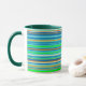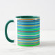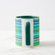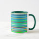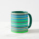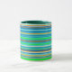 Esta caneca alegre é decorada com um teste padrão vívido do verde, do ouro, da laranja, do azul, da turquesa e das listras horizontais brancas e aparada com verde.