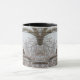 Uma cena pacífica de neve caindo em volta de uma águia careca empoleirada em um galho.