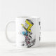 Nossas características de design da caneca do conto de fadas uma ilustração do divertimento do caráter louco do Hatter aventuras das 1865 da Alice do livro no país das maravilhas por Lewis Carroll. O Hatter louco é um dos caráteres principais que faz o tea party louco ir com um balanço. Seu chapéu alto ainda tem seu preço sobre - 10/6 ou 10 xelins e 6 moedas de um centavo no dinheiro britânico velho. O subtítulo do livro é as citações, "nós é tudo louco aqui."  Nós adicionamos alguma coloração ao equipamento estranho do Hatter louco.  A ilustração original é por John Tenniel.  A caneca seria o presente perfeito para Alice em fãs do país das maravilhas, e seria divertimento a ter no escritório.  Você pode personalizar a caneca mudando o texto ao terno, simplesmente usando o botão da personalização.